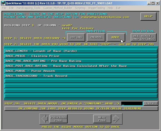 Figure 1 - QuickHorse Race Data listed in the Custom Method Builder Feature Below find both the QuickHorse Name of the data in bold type, and its description in normal type face. Listed first are those same items as are shown in Figure 1 - see above. RACE_LENGTH - The length of this race (running distance) in yards (not furlongs). RACE_PRICE - The Claiming Price of the horse at the time of this race. QuickHorse's free data doesn't include data for this field. It should not be used to create a column unless you are using Brisnet Pay Data. RACE_PRE_RACE_RATING - This data is a number between 0 and 100 which represents a Race Rating prior to the running of the race. This value is calculated by averaging the most recently available BrisClassRating - see OUTING_BRISCLASSRATING - for each horse in today's race. This average is then checked against the Base Grade Rating value. This Base Grade Rating is ZERO for M, C, CO or S Grade Races (see RACE_GRADE below), 50 for all N, T, TR or A Grade Races and 80 for all G1, G2 or G3 Grade Races. The Race Rating computed must be within the appropriate base grade rating range and if not, it is set to either the upper or lower range of values corresponding to the Grade. For example, the average value of the last BrisClassRating for all horses is 75, and today's race is an allowance race. The Pre Race Rating is 75 because 75 is an acceptable value. On the other hand, if today's race was graded as G3, the Pre Race Rating would be set upward to 80. And if the grade of the race was CO, the value would be set to 49. The bottom line is there are two pieces of information which affect the Race Rating. The track applied grade of the race which can limit the value of the Race Rating, and the mathematical calculation of BrisClassRating. RACE_POST_RACE_RATING - This data is a number between 0 and 100 which represents a Race Rating assigned to a race AFTER the running of the race. This value is calculated first by establishing a BASE GRADE RATING for the race. This Base Grade Rating is ZERO for M, C, CO or S Grade Races (see RACE_GRADE below), 50 for all N, T, TR or A Grade Races and 80 for all G1, G2 or G3 Grade Races. After that, an OFFSET VALUE within that Base Grade is calculated. To calculate this offset value, each horse's Bris Class Rating (See OUTING_BRISCLASSRATING - is calculated for this race. An average of those values is computed, and this average value is initially considered the Post Race Rating for this race. However, if this value falls outside the Base Grade Rating thresholds, ie from 0-49 for Claiming, 50-79 for Allowance type, and 80-100 for Graded Stakes, then its final value is limited by those thresholds. For example, the average value of the last BrisClassRating for all horses for today's race result is 75, and today's race is an allowance race. The Post Race Rating is 75 because 75 is an acceptable value. On the other hand, if today's race was graded as G3, the Pre Race Rating would be set upward to 80. And if the grade of the race was CO, the value would be set to 49. The bottom line is there are two pieces of information which affect the Race Rating. The track applied grade of the race which can limit the value of the Race Rating, and the mathematical calculation of BrisClassRating. The reader should look up OUTING_BRISCLASSRATING to learn how this value is calculated. RACE_PURSE - Simply the value of the entire purse for today's race. RACE_TRACKRECORD - The track record at this distance and surface at this track. QuickHorse free data doesn't list these times. These times, therefore, are only available with Bris Pay Data. The following definitions are for other data items related to the race, but these are not included as accessible to the Custom Method Programmer (so there are not listed with the RACE_ prefix). Rather they are used by QuickHorse to deliver content to the user in so far as they are used in Backtesting and Supertuning. RACEID - A string of characters which consists of 3 characters for Track Id (3rd character may be blank if the track id is composed of 2 characters, along with 8 digits of the following composition YYYYMMDD where YYYY is the year in which the race took place, MM is the month the race took place, and DD is the day the race took place. These 8 characters are then followed by a hyphen character, which is then followed by 2 digits which give the Race Number. If the Race Number is a single digit, a ZERO (0) is placed before that number giving 2 digits for Race Number in all cases. Since this item is a string of characters it isn't really used by Column Building because it is not arithmetic. This data is used by QuickHorse to index races within the QuickHorse database so these races can be accessed when requested by the user. Example: CD 20100127-01 meaning Churchill Downs Race 1 on January 27th, 2010. GRADE - a one or two character description of the race type or grade. This value may be any of the following: "M" - Maiden, "C" - Claiming, "CO" - Optional Claiming, S - Maiden Special Weights, "N" - non-graded stake/handicap, "T" - Starter Handicap, "TR" - Trial, "A" - Allowance,"R" - Starter Allowance, "G1" - Grade 1 Stakes/Handicap, "G2" - Grade 2 Stakes/Handicap, "G3" - Grade 3 Stakes/Handicap This grade information is displayed on the QuickHorse Outings Displays - See Figure 2 of the Standard Method beneath the column labeled "GRD". As was the case with RACE_ID, this field is character in nature, and can not be used to calculate a Column value using the Column Builder. RESULTS - A table of values in an order that matches the listing of horse's names in the race program which give the finish position for each respective horse. For example, a horse whose name is "Whistlers Mother" is the first horse listed in today's program and this horse finished 5th. This means the first value in the results table would be the finish position of this horse which would be a 5 for 5th place. CONDITION - Track Condition as listed in