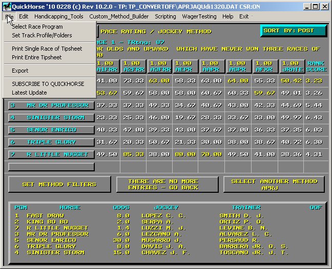 Using the "File" Menu Bar Item This menu bar item allows for standard operations such as Printing and Exporting information from QuickHorse. It also allows you to select from amongst all your race programs, and to set up or create Track Profiles. Track Profiles allow you to set/store inputs that you feel are important for each track. It is very important for you to understand what Track Profiles are and how they are used in your handicapping methods. See "Set_Track_Profile/Folders" on the left hand side of this web page. The "File" Menu Bar also allows you to subscribe to QuickHorse, and to download the latest updates of the software.