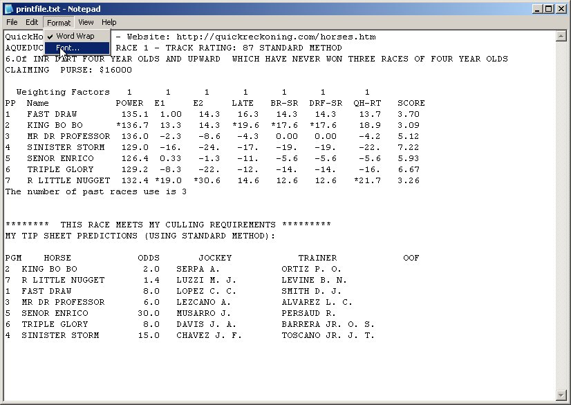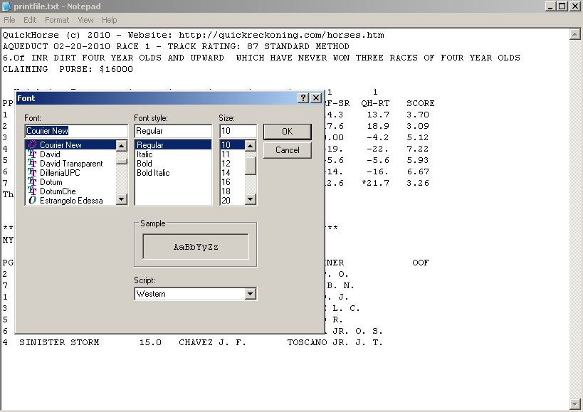 Printing only the Tipsheet for the Currently Displayed Race Printing with QuickHorse actually means "Create a Text File and Display that file in Notepad so it can be printed". When you click on the "Print_Single_Race_of_Tipsheet", the currently displayed race's handicapping information will be used to create a text file called printfile.txt. Then a Notepad Window will popup and display the contents of that file. You may then use the PRINT feature of Notepad to print this "tipsheet". The text file created is designed to be used with a font such as Courier New which means that all characters take up the same amount of space when displayed. Using other fonts to print QuickHorse Tipsheets can result in poor spacing between characters and the output may be harder to read. Always make sure you select the Courier Font in Notepad prior to printing a tipsheet.