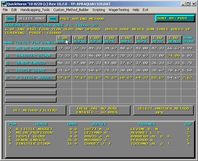 Figure 1 - Pace Rating Method We begin at our Pace Rating Method display which, by now, should be pretty familiar to you. Next we select any one of the Buttons which contain the Weighting Factors (above each column of data). These buttons also contain the column headings. See the Cursor in Figure 1 above. After selecting this button, Figure 1a will be displayed and shows all the Weighting Factors so that they may be edited. Also, from this display you can continue with the SUPERTUNE Process.