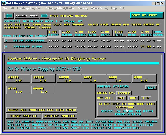 Figure 1a - Display/Set All Weighting Factors Read the HELP file which is accessible from this popup and it will describe to you how to set the weighing factors. It will also describe how to eliminate some columns from the supertune process so that these columns aren't even considered. This is called setting a Weighting Factor to DNU or "do not use". The directions in the next two paragraphs are optional because you are just beginning to use QuickHorse. Move the cursor to the location shown in Figure 2, "CLEAR PROFILES". Selecting this button will initialize ALL your track profiles in the currently selected Track Profile Folder and by your track profile setup values for Surface/Distance/Grade for the track being handicapped to "default" tuning values for the method you are using. Default values are always 1.0 for every weighting factor. Select this button, then respond to the next "verification" pop-up with "I WANT TO" indicating you really do wish to initialize all your track profiles to default values. Any time you wish to "start over" with the tuning process, you may use this feature. What it does is delete all your Track Profiles for the given track and track profile selections. This forces the default values to come up. Now, to continue with the supertune process, simply select the large button as indicated by the cursor in Figure 1a.