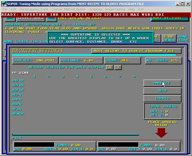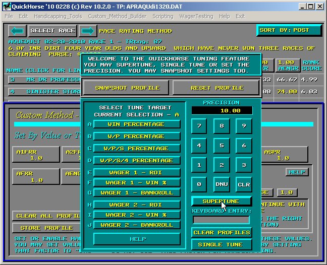 Supertune Track Profile SUPERTUNE - Definition - the process of providing a TARGET VALUE to QuickHorse and allowing QuickHorse to find an optimum set of WEIGHTING VALUES for a particular handicapping style to provide a maximum value of the TARGET VALUE. To SUPERTUNE QuickHorse uses historical race data and the BACKTEST WAGERING features automatically. As it does this, the weighting factors are changed and tested to customize your handicapping method based on whether you want a large ROI, Winning Percentage, Maximum Bankroll or several other outcomes. By now you should have become familiar with QuickHorse "WEIGHTING FACTORS" and how to tune them manually. If not, then please read about that topic within the "Select_Standard_Method" Menu Bar item before continuing with SUPERTUNE. What you've done is, change the WEIGHTING VALUE for some particular column of a handicapping style, run BACKTEST, then observed the outcome, hoping that some "target value" would improve. The target value might have been your WIN %, or ROI, or even your BANKROLL. This section of the User's Guide will discuss the setup and use of the SUPERTUNE and Single-Tune features of QuickHorse. If you have not already done so we encourage the user to try the "Super_Handicap_Entire_Card" feature as this feature is less complex than SuperTune and can be faster to learn and to use. SUPERTUNE will automatically test different values of all the weighting factors of a handicapping method in order to attempt to find the maximum value of the target value. Very simply, this is exactly what you've been trying to do by providing your own weighting factors. The result of SUPERTUNE is a more rapid result of what you've been doing manually. To follow along you may use any race program you wish.