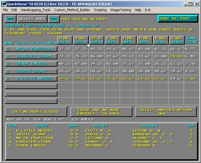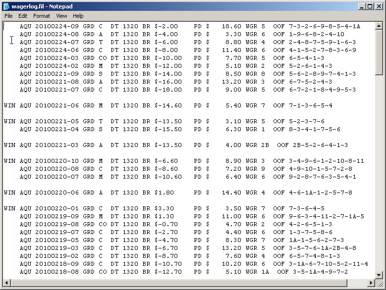 Figure 7 - Here are the wagers we won and lost Now you've completed a sample SUPERTUNE for the Pace Rating Method using ROI, you might now select different targets like WIN% or Bankroll. Also, instead of SUPERTUNE, try selecting SINGLE-TUNE. This feature simply attempts to improve a single weighting factor, the LAST ONE you selected on the Display/Set Weighting factors display - see Figure 1a, while SUPERTUNE does all of them at once. NOTE - QuickHorse can not guarantee that it has selected the optimum settings. The reason? It can not test all the Trillions and in some other cases Quadrillions of combinations possible and do so in a short enough timeframe to be helpful to you. For example, a method with 8 factors to tune would require 100 to the 8th Power number of unique combinations of the eight weighting factors to test all combinations. Even if Super-Handicapping only involved simply counting to that number which is 10,000,000,000,000,000 - 10 Quadrillion - your computer would require a lot of time to do only that. Consider that if your computer can do 1 Trillion calculations per second (which is impossible today), it would take 10,000 Seconds to count to 10 Quadrillion. That's 2.78 hours if doing so only took 1 instruction. Testing each one of these combinations would require 100's of instructions, which would bring us to the time of almost 278-2780 (100-1000 instructions) hours just to Super-Handicap one race. Given all these large numbers, what we've come up with are enhanced algorithms which provide the best guess of which combinations work and we do so in minimal time. So that, with a relatively new computer system available today, you can Super-Handicap an entire race card in 15-30 minutes. Each GRADE can be individually tuned just as was the case for manual tuning. As you can see, using QuickHorse requires you to feed it data and may require you to keep a "tuned method" fresh. By this we mean that conditions may change and you may notice that your method loses some of its statistical returns when you backtest a week or a month from now. The less data you use (history programs/charts), the more often your system will need tuning. In theory, if you took a complete season of data and tuned it, you would be able to count on the results you obtained for the next season, as long as no major changes occurred in that track. This is what statistics is all about. |