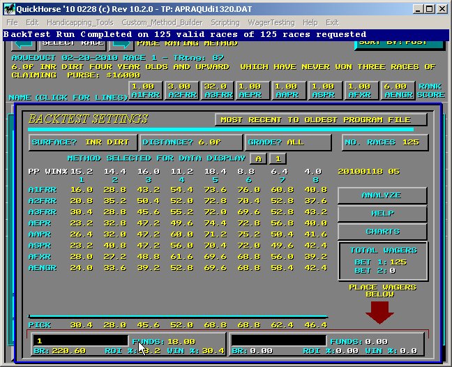 Figure 4 - Supertune was Selected, Backtest Appears You are almost ready to tune for ROI, however, you must first enter a wager! There are two wager buttons at the bottom of this BackTest display. click on the 1st Wager Button which is the one to the Left Hand Side of the lower bottom of the display. Once you click on this button the wager entry display will pop up. You should read the HELP file to learn how to enter a wager. After entering a Wager (nothing else is necessary nor is anything else used except for BASE WAGER amounts which you should also check and update if necessary), simply click the Right Mouse Button to close this Enter Wager popup and return to the BackTest display. After wager entry, we are now ready to SUPERTUNE the Pace Rating Handicapping Method based on maximizing the ROI%. Select the ANALYZE button and QuickHorse will perform the SUPERTUNE of this method. What happened?